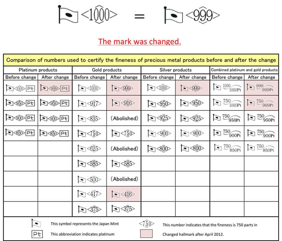 日本の造幣局の証明であることを示す日本の国旗「日の丸」の画像と1000分率で品位(純度)を表すひし形の中の数字からなります。