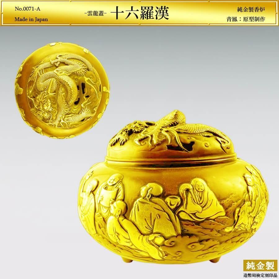 Item 0071 is solid 24-karat gold incense burner of the sixteen Arhats (Jūroku Rakan in Japanese), Buddha personally chose the Sixteen Arhats from among his disciples.¡¡Lid: Dragon.