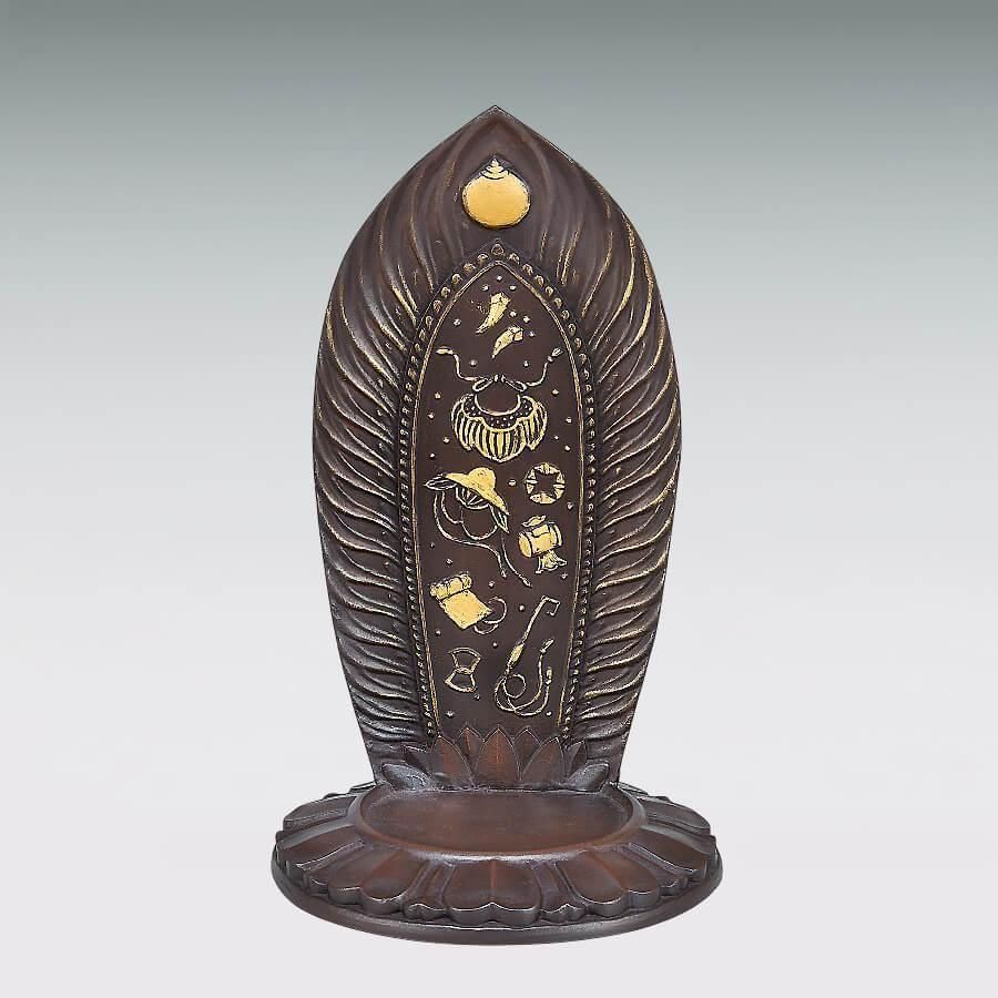 袈裟(けさ)の袖には金字の模様が描かれ、光背の裏には宝珠(ほうじゅ)と恵比須(えびす)が持つ打ち出の小槌(こずち)や大黒天(だいこくてん)の釣り竿など宝尽くしが金色で彩られています。