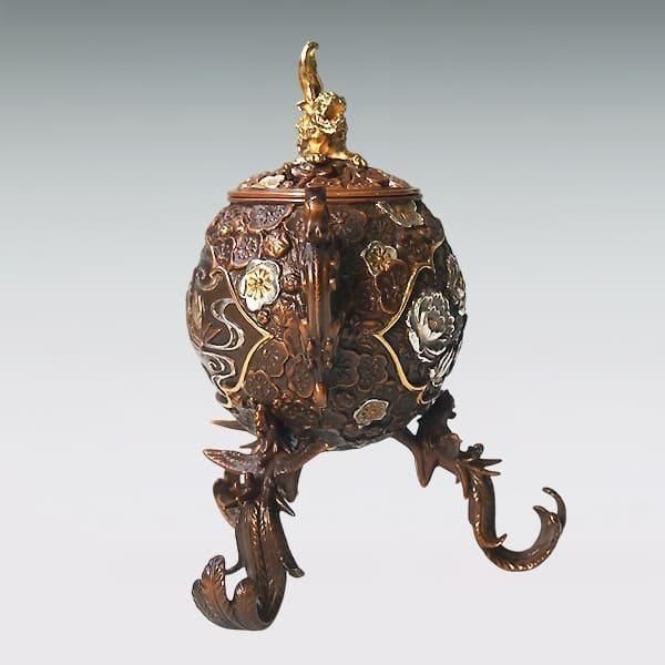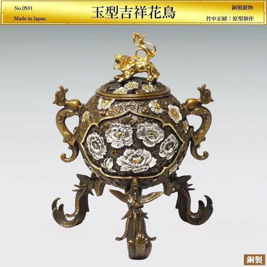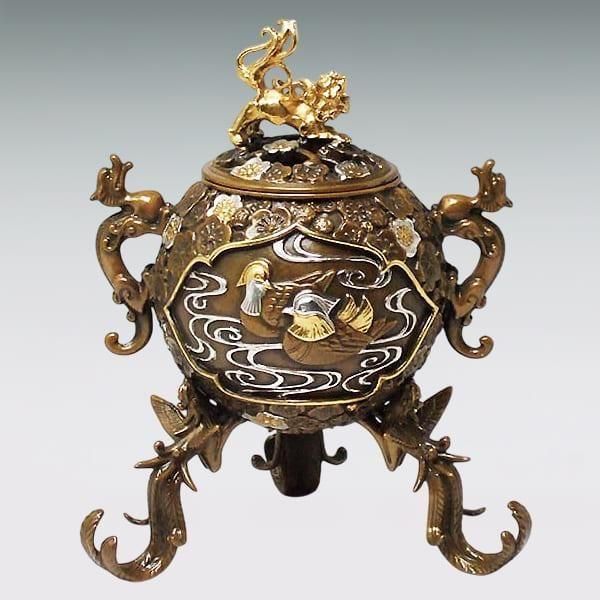 玉型 吉祥花鳥香炉 獅子摘み H17.5cm|銅製・煮色差しメッキ|竹中正晴:原型制作